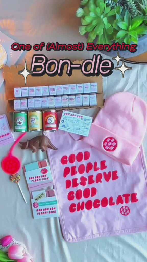 Can’t decide? Don’t worry—you don’t have to! The One of (Almost) Everything Bon-dle is the ultimate Bon Bon Bon experience, packed with a little bit of (almost) everything we do best, including some of our top selling swag. This bundle is the perfect gift for the adventurous chocolate lover, the indecisive snacker, or the Bon-obsessed fan who just wants it all 🍫✨